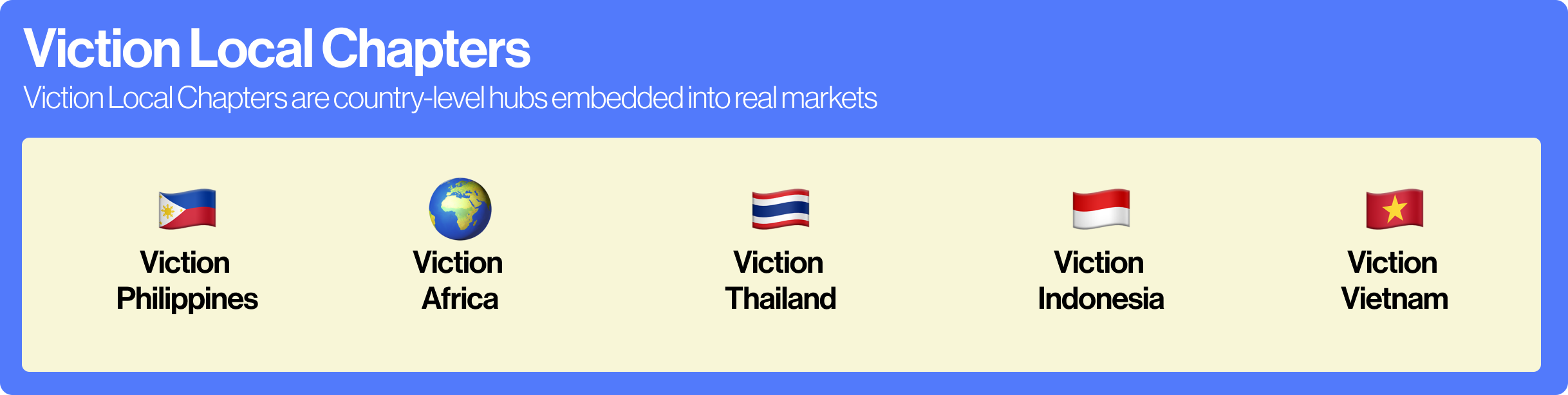 Viction Local Chapters are country-level hubs embedded into real markets — led by people who understand their region’s language, culture, and community behaviors.